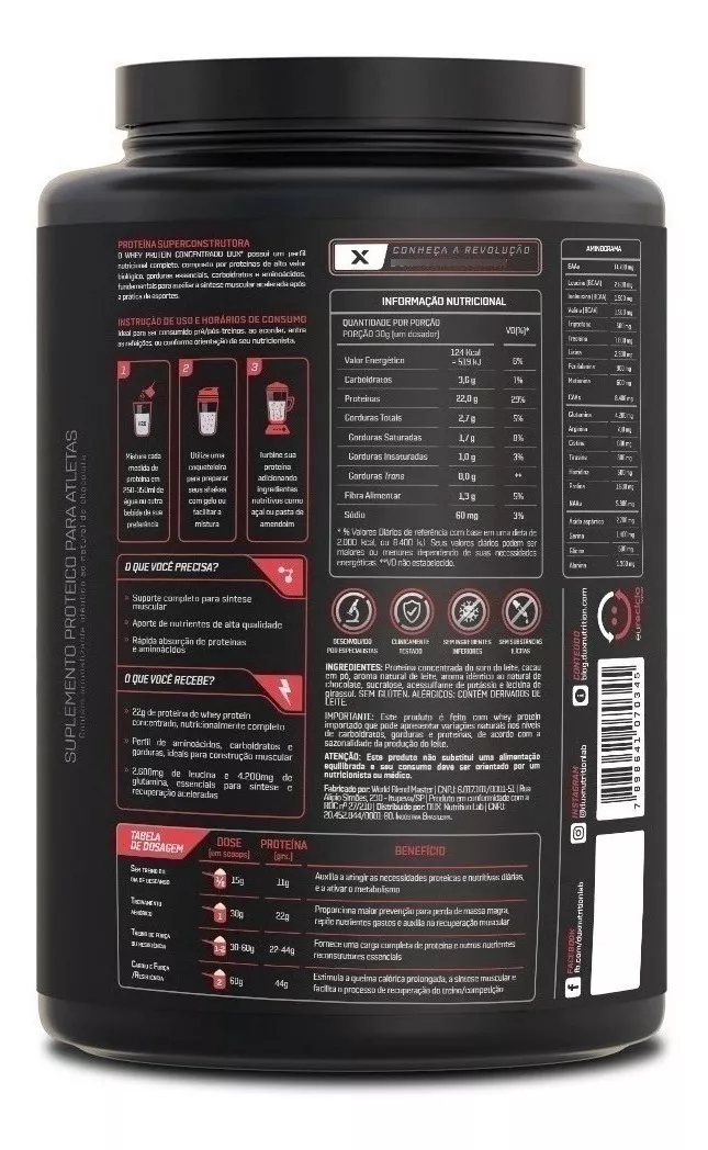 O Whey Protein Concentrado da Dux oferece um perfil nutricional completo, tornando-o uma excelente escolha para consumo antes e depois dos treinos. Cada porção fornece 20g de proteína 100% pura e de alta qualidade, extraída diretamente do soro do leite e sem a adição de blends ou outras proteínas. Possui um perfil completo de aminoácidos, incluindo todos os aminoácidos essenciais, que são cruciais para a construção muscular, a recuperação rápida e a manutenção da massa magra. Sua fórmula balanceada fornece suporte energético equilibrado e uma recuperação mais eficaz.
